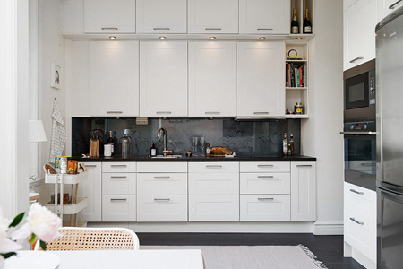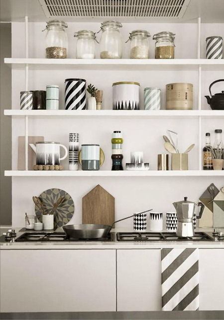 台面上的拐角不利于用就会变成卫生死角,用尺寸刚好的收纳盘摆放其中,把那些你最喜欢的厨房用品放在其中。裸露在外的物品最好精致,并有独立的格调,形成一景。