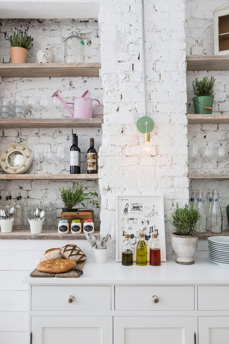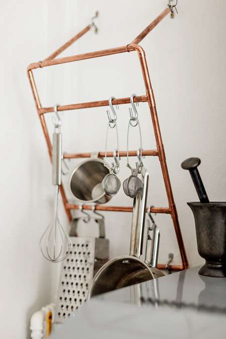 在墙面上固定上一个复古挂杆,随意将你淘来的各种好看的炊具挂在上面,复古的锅和盆,以及各种常用的物品一股脑儿挂在上面也无妨,就算不经常使用,只为挂着好看也足矣。