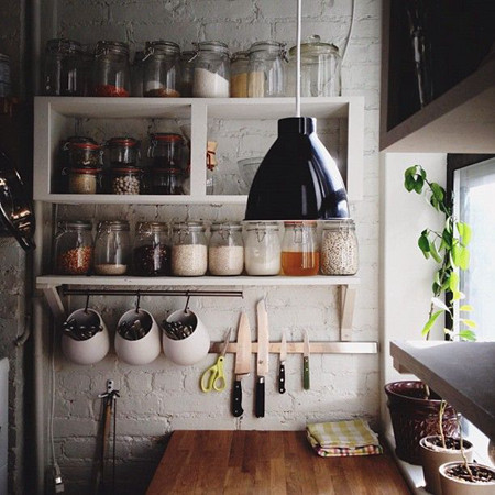 墙面的收纳功能是最强大的,形式也是多种多样的,可以做多层板设计,不用做柜门方便取用物品,或者利用墙面的本身的凹洞做收纳,也可以充分利用管道来大做文章,就地取材美观实用。双层的吊柜设计非常合理,下面的薄一些,上面的厚一些,射灯放置在上面的吊柜,在不影响使用的前提下,充分利用空间。墙面装置上可移动的滑杆,让锅碗瓢盆都挂起来,只要多准备一些s挂钩,将就能将墙面空间利用起来,且能做到美观有序。