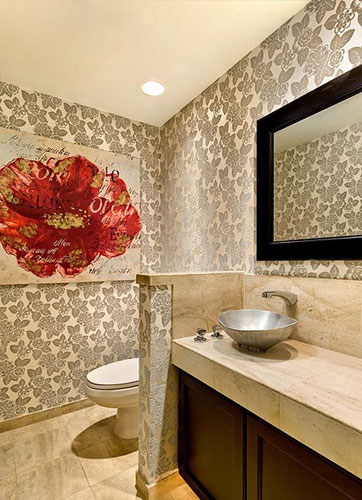 小块的隔断设计将坐便器区域与盥洗区域适当隔开,制造出小隔间的效果。卫浴间墙壁上美丽的花纹壁纸,在隔断墙上也有所呈现,让整体更为雅观。