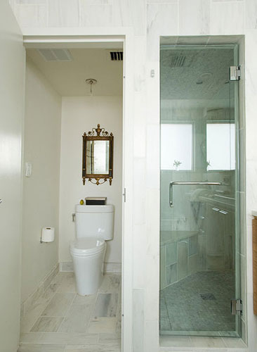 空间偏正方形的卫浴间区域,很好的利用了这一特点,在均匀的空间中大胆设置多个隔断,细致划分卫浴间功能区,坐便器靠墙角内侧,前方隔断制造出淋浴间,左侧隔断,隔开盥洗区。而整个卫浴间特别采用的欧式风瓷砖,让小空间魅力无限。