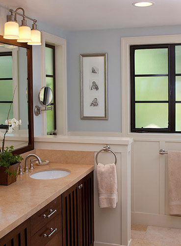 卫浴间被划分为两个区域,半开放式的隔断便是分界线。隔断采用了适当的加减设计:浴缸与卫浴柜间的墙体相对作高到空间间二分之一的地方,将较潮湿的浴缸隔开的同时,适当照顾隐蔽性;另一半则为玻璃门的设计。整个隔断留存得当,既起到阻隔作用又保证了卫浴间的宽敞观感。