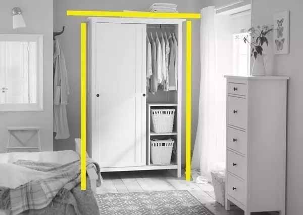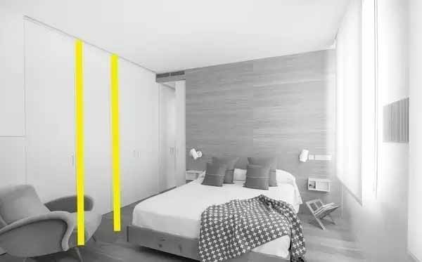 第一张图是宜家的样板间,这个衣柜是我们常常购买的成品衣柜,大约2.1-2.4米高,竖向线条被衣柜线条中断,纵向视觉延伸被阻断(查看标注的黄色线条)。