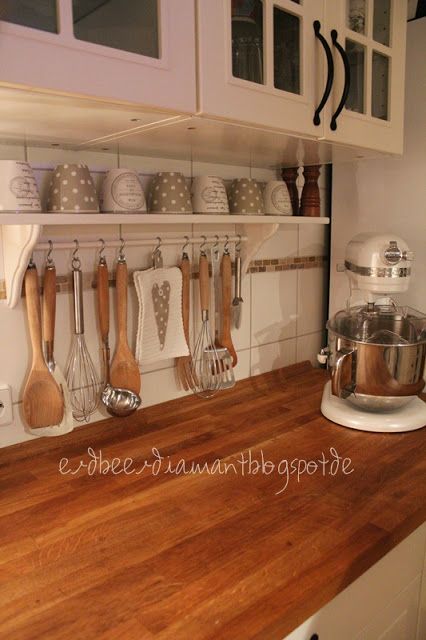 厨房的立面收纳也是一个老话题了,各类厨具最好都能挂在墙上,因为我们的最终目的是清出橱柜的台面。还可以在墙上装一块小搁板,用来收纳杯子一类的常用物品。
