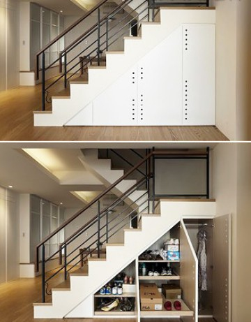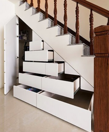 楼梯因为它的外形而占用了不少有用空间,在多数的家庭里,通常都将其下方的空间作为储藏物品之用。例如,可以加装一扇门,里面摆上几个储物箱,分门别类地收藏东西。另外,还可以根据楼梯台阶的高度错落,制作大小不同的抽屉式柜子,直接嵌在里面,可摆放不同物品。