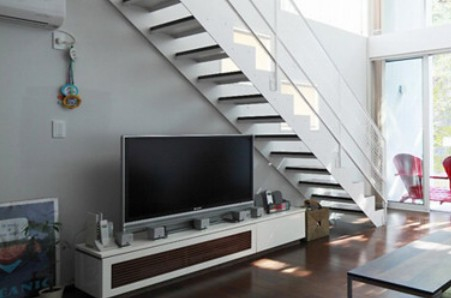 如果楼梯在客厅非常显眼的位置,楼梯下的空间更是要好好利用。电视柜和电视机按照楼梯下的空间特别定制,空间得到了有效利用,而且看起来非常有设计感,空间也显得简洁清爽。