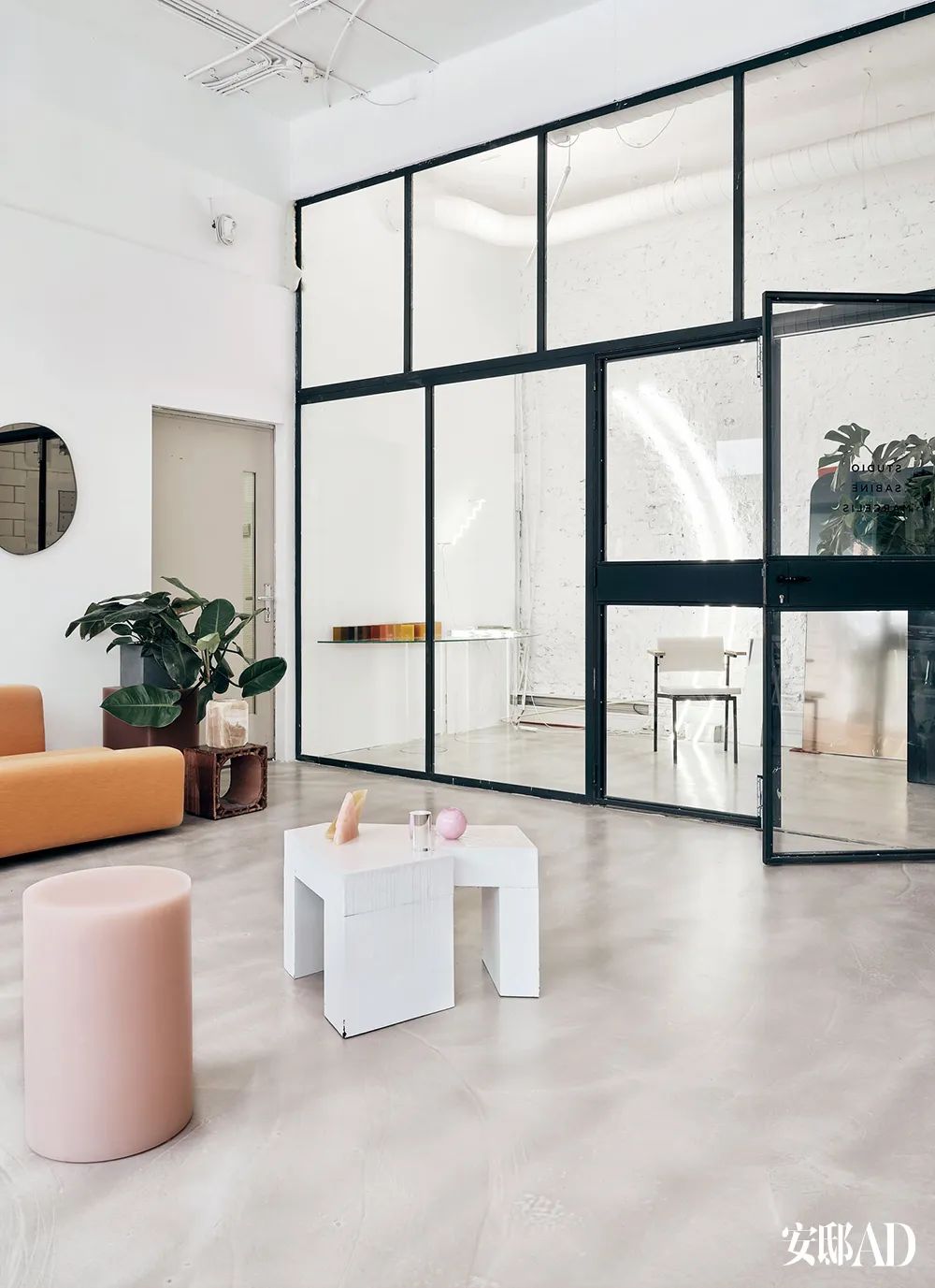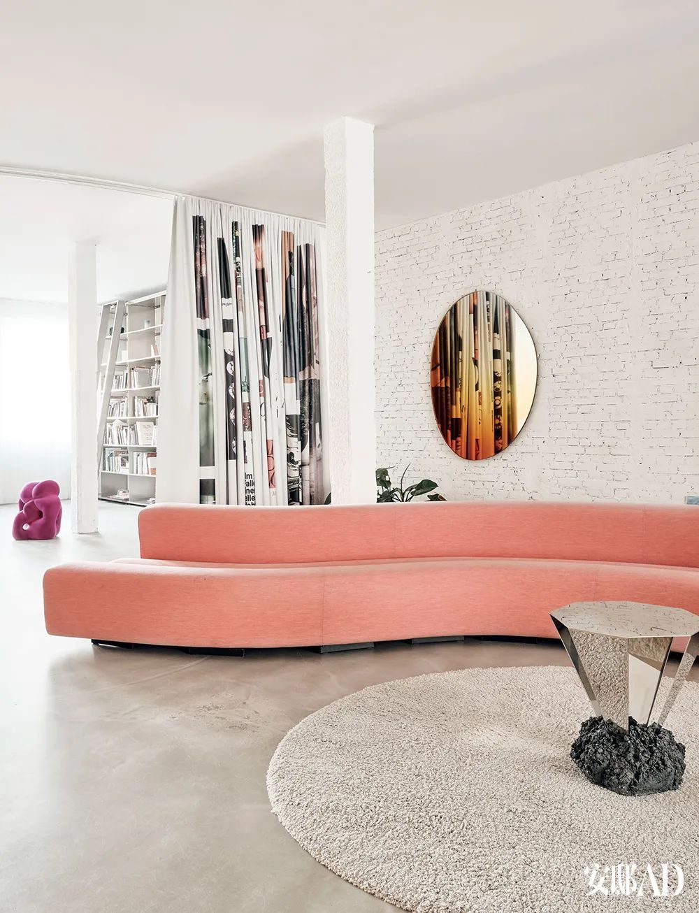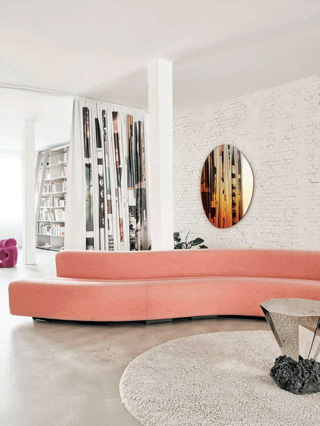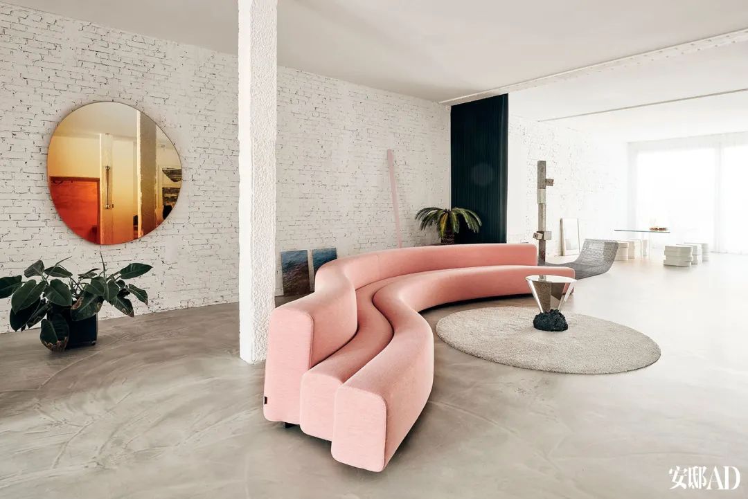 Pierre Paulin设计的Osaka 长沙发包裹着粉色的Febrik饰面,蛇行般穿过开放式空间,圆形地毯上,出自Sabine的朋友和合作伙伴、丹麦艺术家FOS的Diamond咖啡桌,材质是混凝土和镜面钢,墙上挂着 Sabine和Brit van Nerven设计的Off Round Hue镜子。