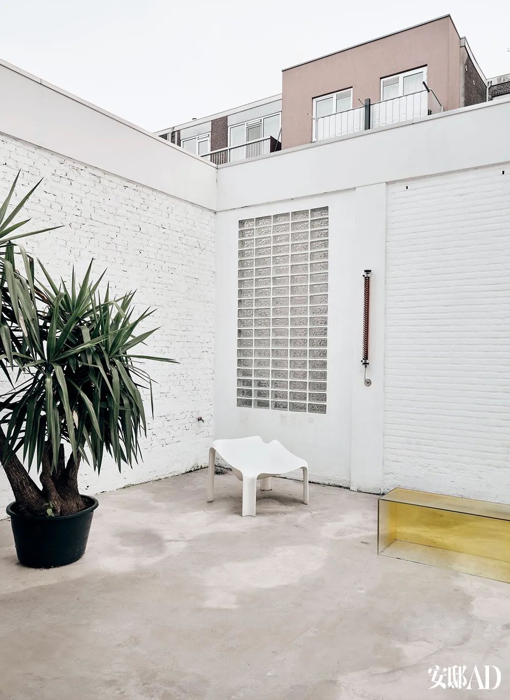 露台以后还会再改造为泳池区,嵌于外墙中的复古玻璃砖是Paul在法国发现的。白色的复古椅子出自Pierre Paulin,黄色玻璃长方体是Sabine为戛纳电影节荷兰馆设计的作品原型。