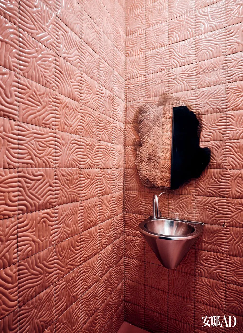 走廊左侧的门后便是浴室,浴室的内部铺着艺术家Jonas Lutz设计的“鲑鱼粉”Salmon瓦片。镜子由瑞典艺术家Jenny Nordberg设计,来自Etage Projects,金属水槽来自二手市集。