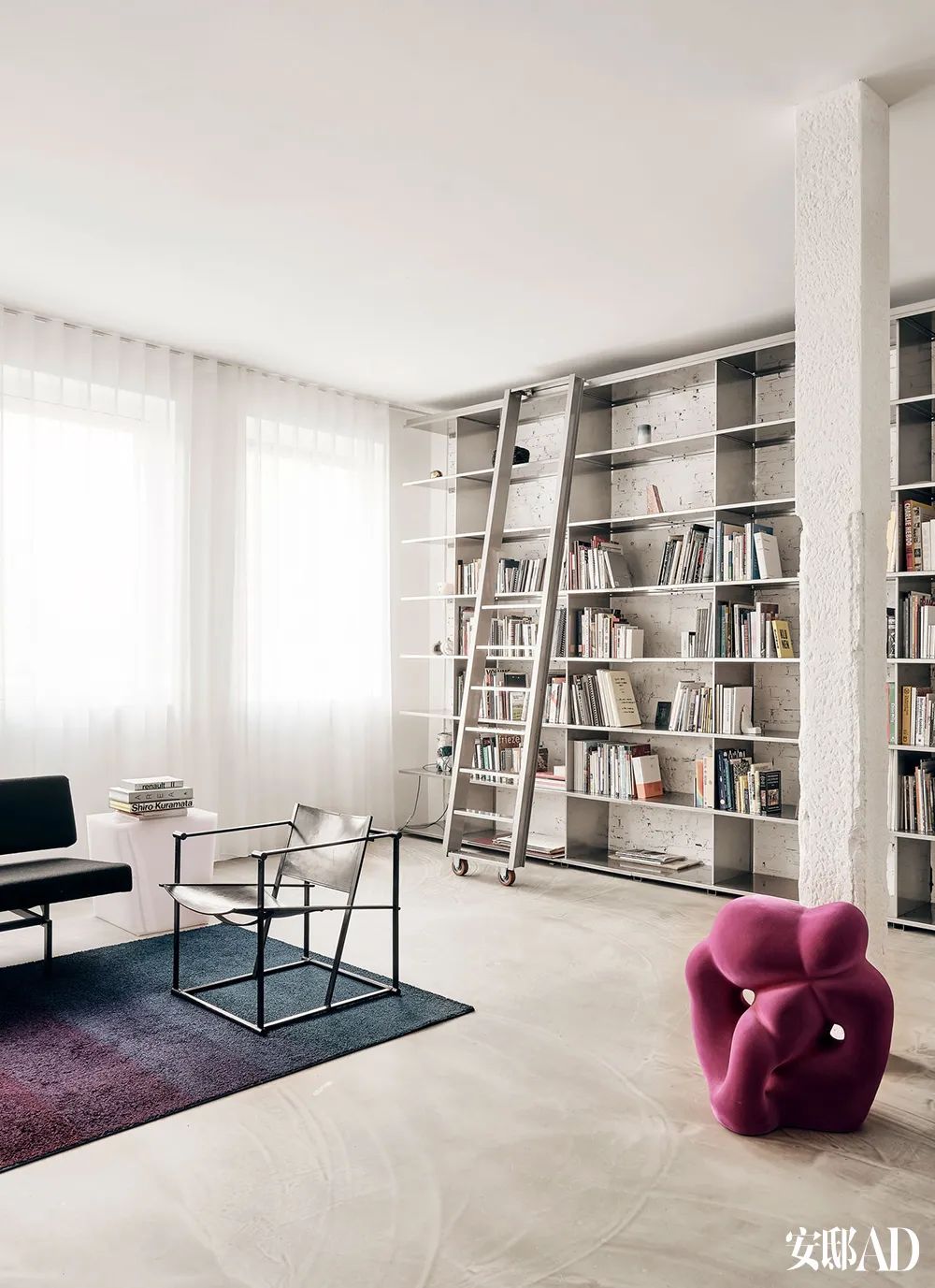 书房里,Phil Proctor设计的从地面到天花板的整墙书架,书架上摆放着屋主最珍视的书籍和物品。玫红色的Impose马鞍式座椅出自Handmade Industrials,其材质是包裹着植绒的聚苯乙烯。白色边桌是为Celine定制设计的Pyramid Candy Cube立方体。地毯出自荷兰城市Eindhoven的设计师二人组Rens。