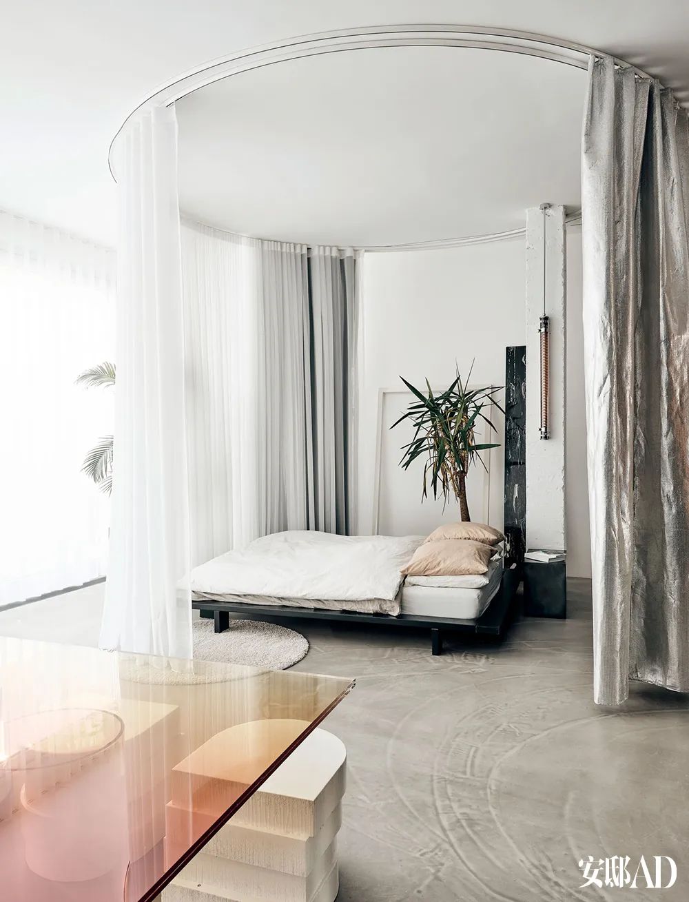 “我们希望家中没有墙壁的阻隔,这里最初就是个没有隔墙的空间,延续敞开的状态也符合我们的设想。我们尽最大可能保持开放无阻的布局,只在必要情况下用帘子制造暂时的分区:卧室、客厅、餐厨区、影音区;只要打开帘子,这些区域立刻汇合为完整的空间,灵活地变换出不同的气氛。”Sabine说。