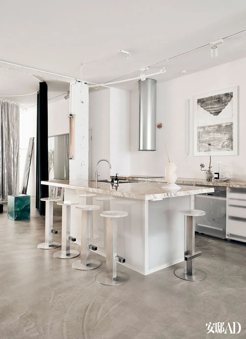 厨房灶台和岛式操作台由Sabine和Paul设计,相匹配的酒吧凳也是由他们定制设计。岛台上的是Valentina Cameranesi为Bloc Studios创作的淡粉色雕塑。墙上挂着一张Jonas Lutz的画作。