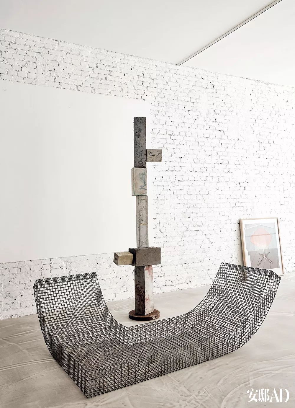 • 以砖块和混凝土为灵感的图腾雕塑出自Magnus Pettersen,弯曲的坐席是比利时设计师二人组Muller van Severen以钢丝制作的Wire S椅的原型。