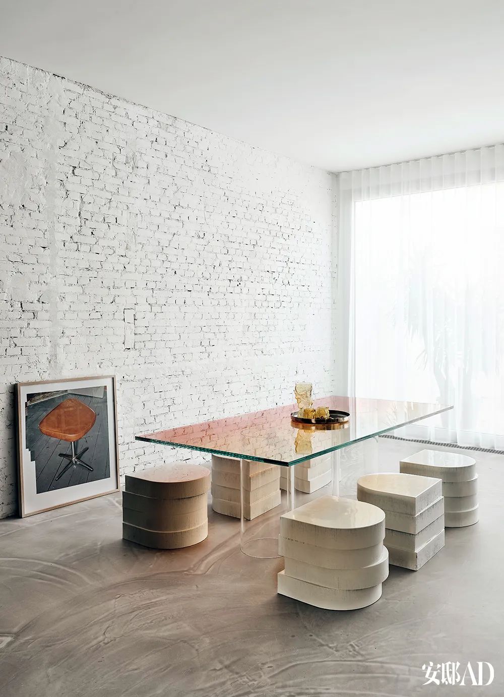 餐厅里,Sabine将以前某个设计项目遗留下来的玻璃板材料用作餐桌的桌面, 奇特的餐椅是用泡沫和树脂堆叠而成的,仿佛是雕塑。桌上的金属托盘里放着丹麦艺术家FOS制作的餐具,以及Paul从跳蚤市场淘来的青铜胡桃钳和开瓶器。地上靠着墙的画作是Pim Top的“Chair #1”。