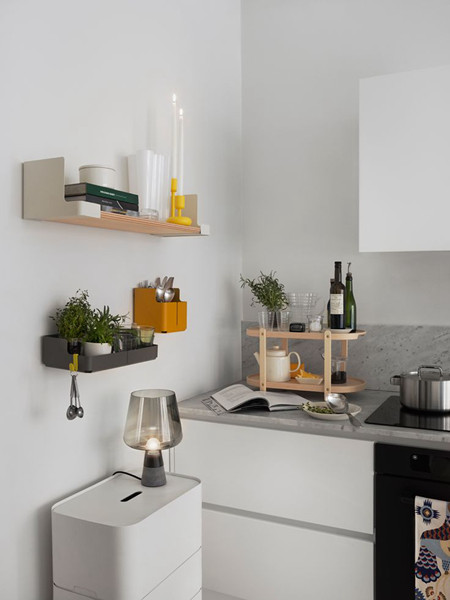 由于一字形橱柜的空间相对较小,灶台的旁边不能设计拉篮,所以在角落上摆放双层的储物架,放置一些常用的器皿,高的瓶子放在上面,矮的器皿放置下面,常用的器皿可以放到旁边的层板架上,这样的布局方式简单好用。