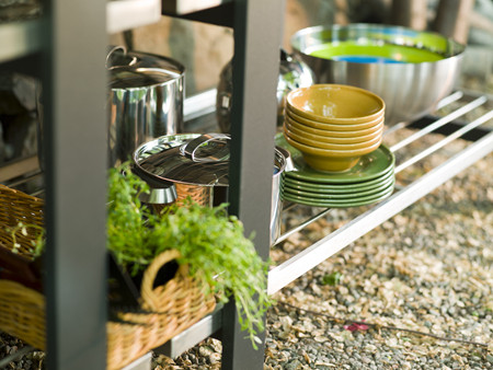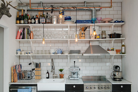 敞开式的层板设计独特,层板之间可用钢管链接,充分利用墙面的所有空间,展示物品一览无余。物品按照不同的使用频率放置,方便取用,还可以根据不同的菜品需要,自由交换器皿位置,也可以按造型摆放,创意出属于自己的个性化搭配。