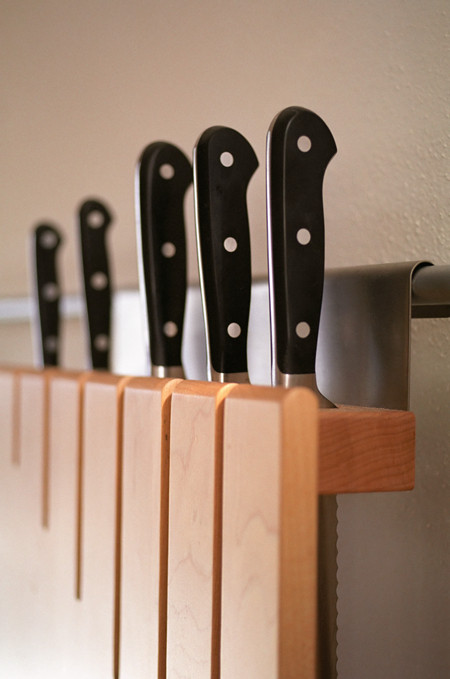 把到刀放在刀架上,用时抽取难免会满慢上半拍,在墙面上固定刀具挂件,将刀具整齐地插在其中,最常用的挂在靠近面板的地方,使用会更加顺手。