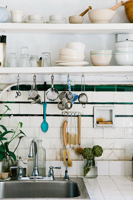 在墙面上固定上一个复古挂杆,随意将你淘来的各种好看的炊具挂在上面,复古的锅和盆,以及各种常用的物品一股脑儿挂在上面也无妨,就算不经常使用,只为挂着好看也足矣。
