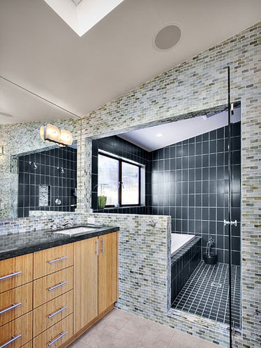 隔断也富有灵性,中间区域的隔断,用黑色马赛克瓷砖魅力包裹,中段部分是灯体,极为美观。它还用搁架与里侧隔断连接,制造出收纳区域,极具设计感。