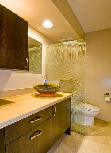 在内侧的坐便器区域,用了玻璃作为隔断让其独立。而玻璃本身的弧形纹理,极为美观灵动,在为卫浴间精致划分的同时,增添了整个空间的美观度。