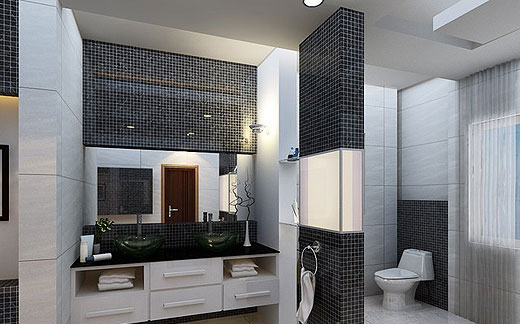 卫浴间被划分为两个区域,半开放式的隔断便是分界线。隔断采用了适当的加减设计:浴缸与卫浴柜间的墙体相对作高到空间间二分之一的地方,将较潮湿的浴缸隔开的同时,适当照顾隐蔽性;另一半则为玻璃门的设计。整个隔断留存得当,既起到阻隔作用又保证了卫浴间的宽敞观感。
