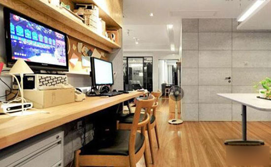 装饰提示:开放式的书房空间,一体式工作收纳桌。电视、电脑、书籍都集中在一起,虽然多但是可以收拾的很整齐。