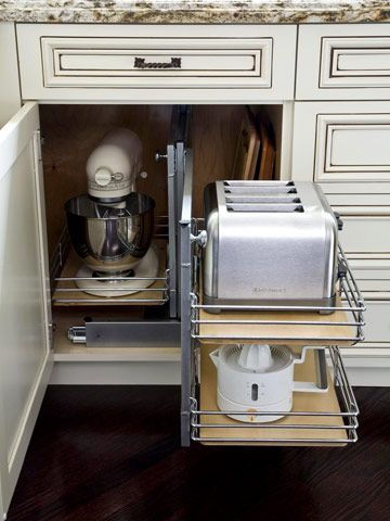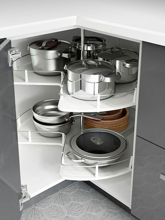 关于橱柜转角处的利用,相信你已经有所了解了。这种旋转锅架是一种非常实用的选择,在有效利用空间的同时,也能方便拿取。