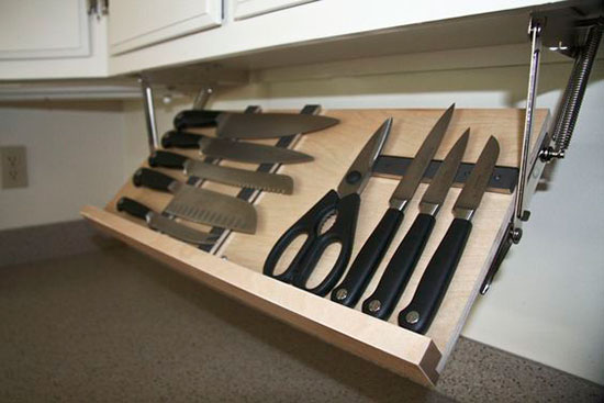 你可能没有想过,吊柜的底部也是可以利用起来的!比如这款安装在底部的刀架,用磁铁来固定刀具安全而便利,不用的时候把它推回去,一点儿都不占台面,可以让台面时刻保持清爽。
