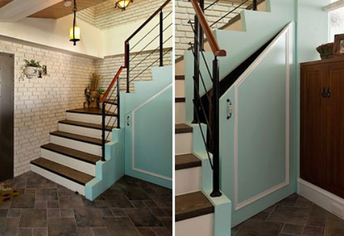 楼梯因为它的外形而占用了不少有用空间,在多数的家庭里,通常都将其下方的空间作为储藏物品之用。例如,可以加装一扇门,里面摆上几个储物箱,分门别类地收藏东西。另外,还可以根据楼梯台阶的高度错落,制作大小不同的抽屉式柜子,直接嵌在里面,可摆放不同物品。