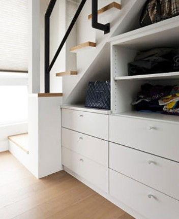 大量抽屉几乎能提供一间独立储藏室的收纳量。楼梯的深度完全利用作为收纳功能。