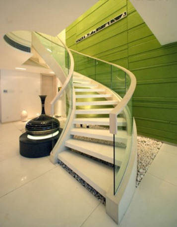 楼梯属于室内空间中比较曲折狭窄难以处理的角落,可以通过一些自然景观的设置加以遮挡和隐蔽。如此一来,既美化了客厅又不妨碍空间的利用,LOFT式住宅楼梯下空间狭小,利用率不高,一个小型水景的设置,或者配以几棵绿植再将天然的石材点缀在地面上,或者摆放精致的艺术品,既利用了室内角落又增添了室内空间的情趣。