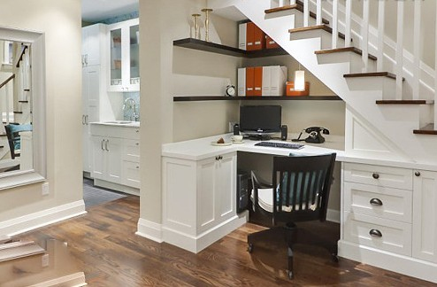 工作间是每个家庭非常需要的一个空间,但在居室设计中往往没有单独的工作间存在,此时楼梯下的空间就成了工作间的一个不错的选择了。做成依楼梯布建的一面墙书柜也是很妙的设计,对于书籍非常多的家庭,不妨利用这块有用的空间,一方面看起来很漂亮,另一方面也非常实用,可以减轻书房的“压力”。